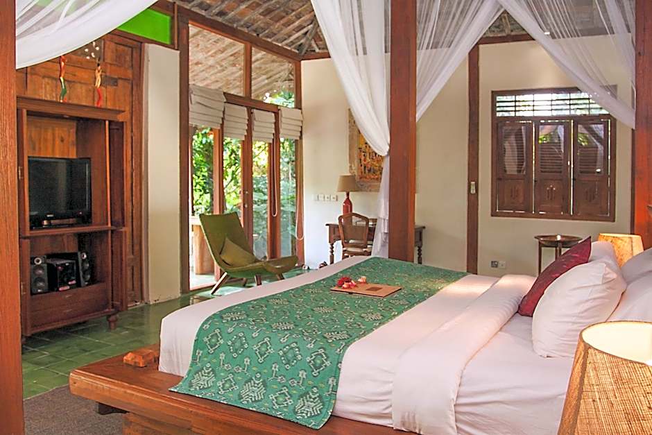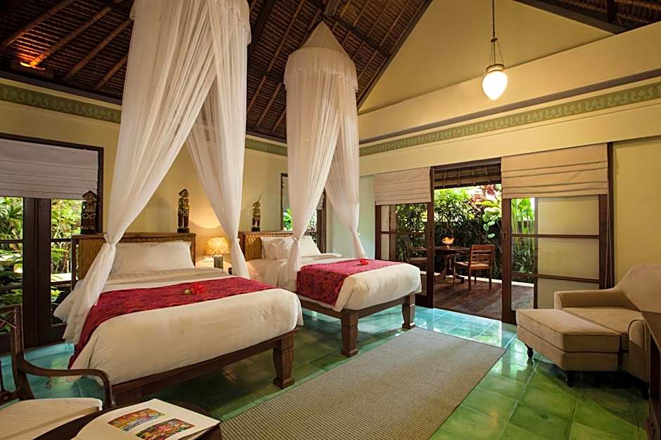 This well-appointed private villa is surrounded by lush Balinese garden. The villa also comes with an private bathroom featuring an outdoor shower, separate toilet and double vanities. There is also a patio with seating area.