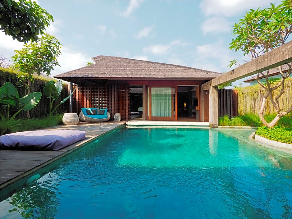 ONE-BEDROOM PRIVATE POOL VILLA is 3767 square feet and includes a king-size bed 150-183 width plus living room, terrace, desk, cable tv, hairdryer, tea and coffee making facilities , ironing set, safe, bathrobes, and slippers.