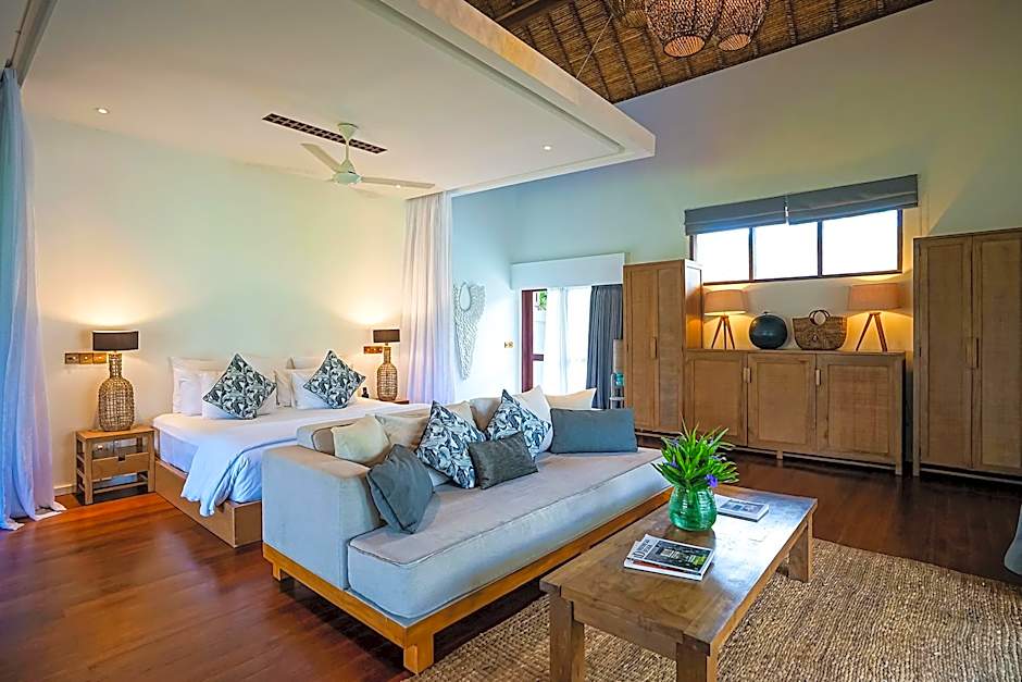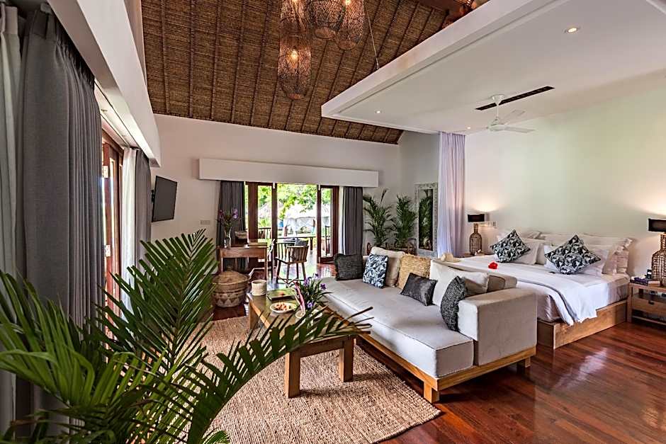 This deluxe bungalow offers a private pool with outdoor showers and bathroom. Guests enjoy a large sun deck and garden with sunbeds and a daybed. The air-conditioned bedroom is fitted with a king bed, a seating area, a mini-bar, a cable TV, and Wi-Fi access.