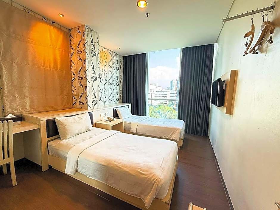 This slightly larger air-conditioned twin room features a seating area, a flat screen TV with satellite channels, a wardrobe, and an private bathroom featuring shower facility, slippers and free toiletries. A view of the city can be seen from the room.