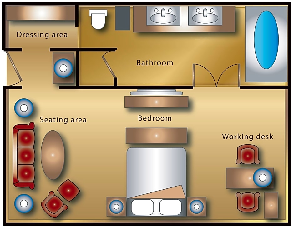 This spacious suite consists of 1 bedroom, a seating area and 1 bathroom with a walk-in shower and a bath. The air-conditioned suite provides a flat-screen TV with cable channels, soundproof walls, a mini-bar, executive lounge access as well as city views. The unit offers 1 bed.