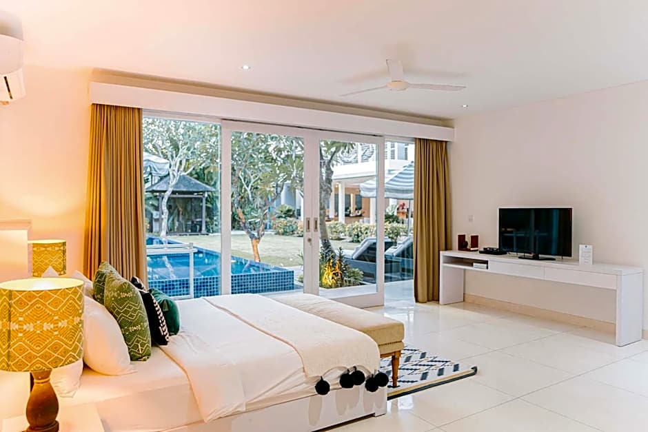 CassaMia Bali - Spacious Luxury 5 Bedroom Villa is a 4-star retreat in Jimbaran, Indonesia. Address: Jalan Bukit Permai, Gang Taman Sastra No.2, Jimbaran, Kec. Kuta Sel, Badung, Bali. Located about 0,7mi from Jimbaran city center, the villa has 23 reviews to date. The spacious layout features a private pool and an outdoor swimming pool (free), a kids’ pool, private parking (free), and complimentary Wi-Fi, plus air conditioning, a private entrance, terrace, balcony, garden views, and a kitchen with kitchenware, kitchenette, and patio.