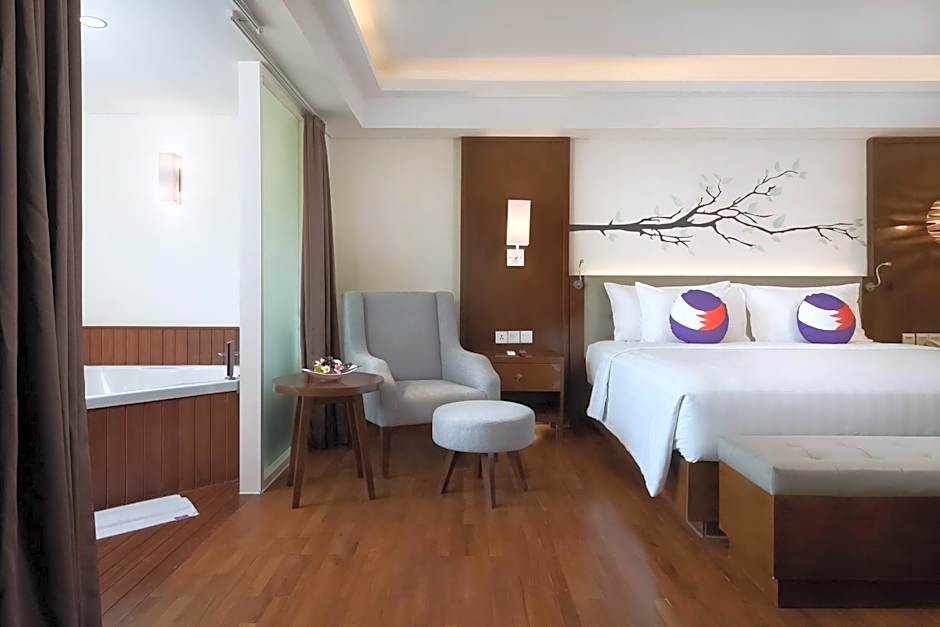 At FOX Hotel Jimbaran Beach, guests can choose from a Deluxe Double or Twin Room with a bathtub, a Junior Suite, a Deluxe Double or Twin Room, or an Executive Suite. These rooms do not allow smoking and can accommodate 2 adults and 1 child. The bed sizes range from King to Queen and Twin beds, and the room sizes vary from 388 to 786 square feet.