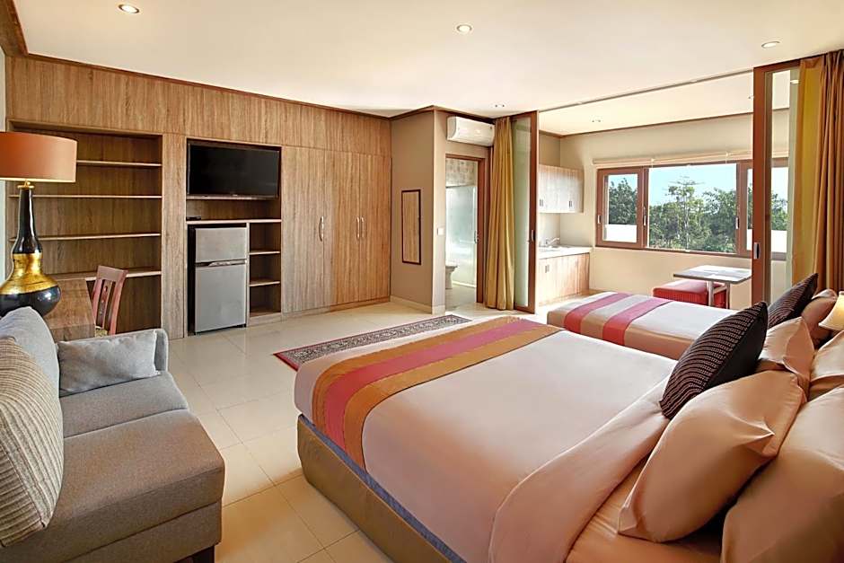 This twin room has a private closed balcony, sofa, seating area, kitchenette, and cable TV.