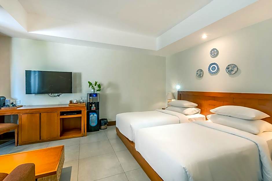 Rama Garden Hotel Bali offers a variety of rooms including Deluxe Studios with pool views or poolside locations, a Luxury Studio, and a Standard Studio. All rooms accommodate 2 adults and 1 child and do not allow smoking. The Deluxe Studios on the first and second floors are TwinDouble rooms with a total of 431 sqft in size and feature a King size bed, 2 Sofa Beds, and 2 Twin beds each.