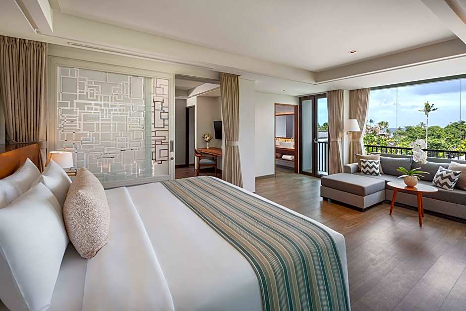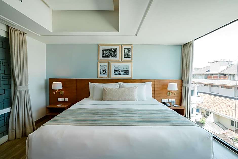 The Family Suite is superbly designed for comfort with a unique artistic twist. This room is comfortable for accommodate up to 5 guest that facilitated with a bedroom and a sofa bed, also separated living room with a sofa bed. A complete kitchen utensil and pantry with dining table for the cooking necessity inside the room. Private balcony with a lazy chair completes this well-appointed room category.