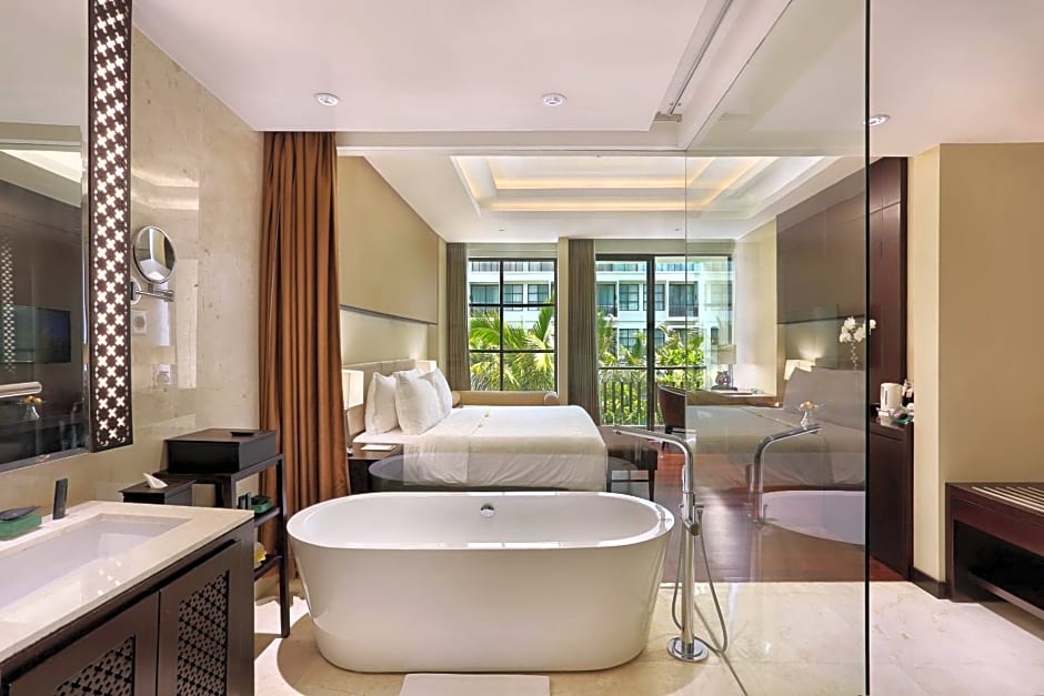 The Bali Nusa Dua Hotel is packed with amenities that cater to your every whim. Dive into the refreshing outdoor swimming pool, unwind in the spa and wellness center, or take the little ones to the free kids' club! Not only does it offer a fabulous restaurant and bar for all your dining desires, but there's also a fitness center to keep you energized during your tropical retreat. Plus, with complimentary Wi-Fi and private parking, staying connected and comfortable has never been easier. Guests have raved about the attentive 24-hour front desk service and the lush garden views, with nearly 841 reviews highlighting the top-notch hospitality and stunning surroundings.