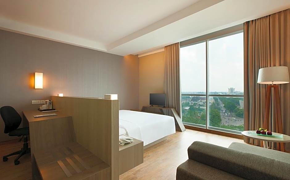 The hotel offers Suite rooms at Hotel Santika Radial Palembang. These rooms are 840 sqft in size and do not allow smoking. The Suite room can accommodate 2 adults and 1 child, with amenities including 1 king-size bed.