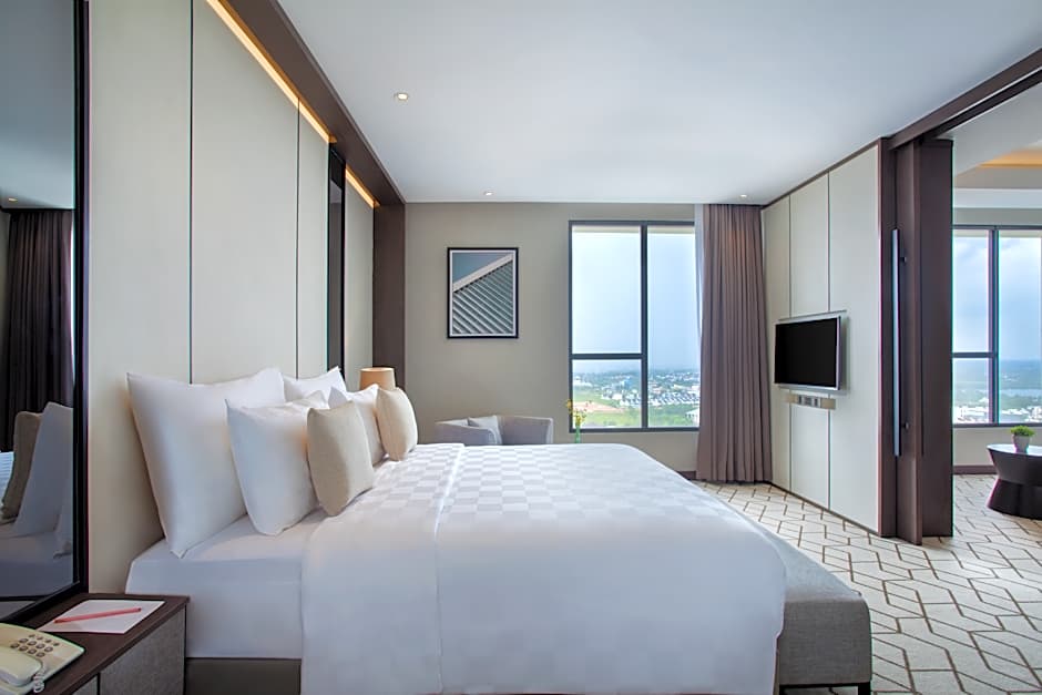 The Wyndham Opi Hotel Palembang offers a variety of rooms including Executive Queen Suite, Deluxe Queen Double, Grand Suite, Presidential King Suite, Junior Suite and Deluxe Twin. All rooms are non-smoking and vary in size from 323 sqft to 1345 sqft. The occupancy ranges from 2 adults to 4 adults, with some rooms accommodating children. Bed sizes include Queen and Twin beds.