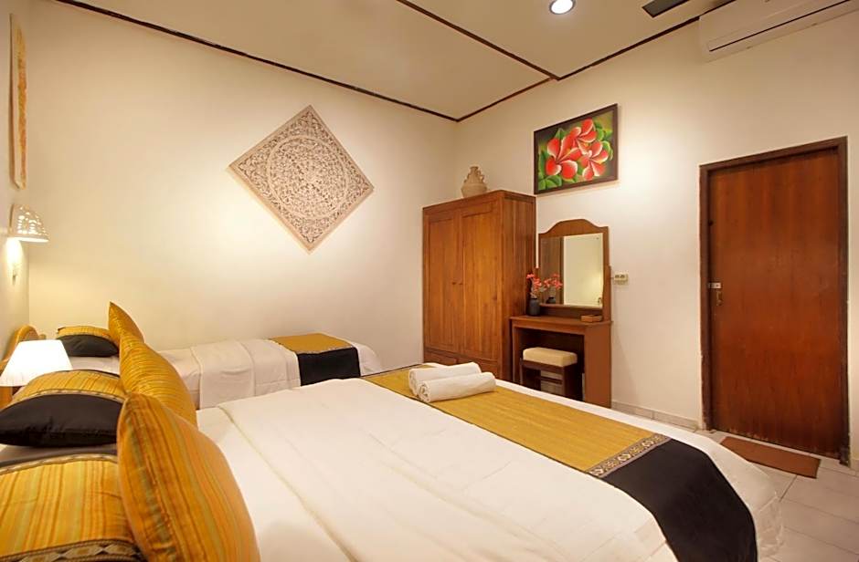 Hotel Jati Sanur offers a variety of rooms including Standard rooms with either one double bed or two twin beds, and suites such as the Two-Bedroom Suite with a kitchen and the One-Bedroom Suite with a kitchenette. Smoking is not allowed in any of the rooms. Bed sizes range from queen to twin, with occupancy accommodating up to 4 adults and 1 child in the suites.