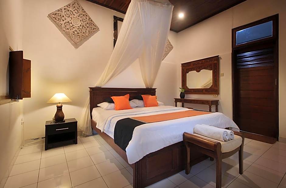 This spacious comfortable room is completed with an air conditioning, TV, desk, fridge, wardrobe, mosquito net and Wi-Fi access. The en-suit bathroom completed with fresh towel, bathtub, shower and essential bathroom amenities. The terrace which overlooks to the beautiful lush tropical garden has two chairs and a table