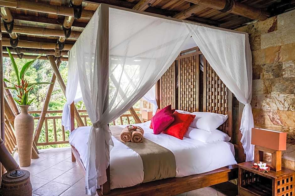 This suite has a balcony overlooking the rainforest and a spacious lounge room with beautiful teak carvings. Extra bed can be accommodated.