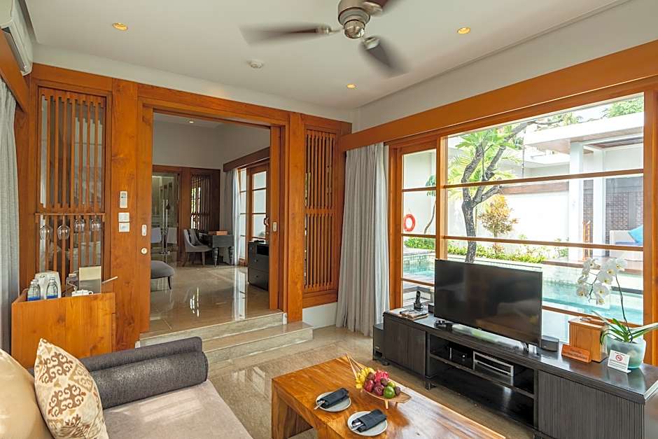 Set on a pristine Seminyak beachfront, this retreat invites sun, sand, and serenity with two outdoor pools offering sea views. Beach access is easy, with free umbrellas and chairs laid out for day-long enjoyment, and free on-site parking adds convenience. Free Wi-Fi, a 24-hour front desk, and a fitness center available at no extra charge keep guests connected and active, while a private entrance and a terrace with garden views contribute to a relaxed, non-smoking ambience.