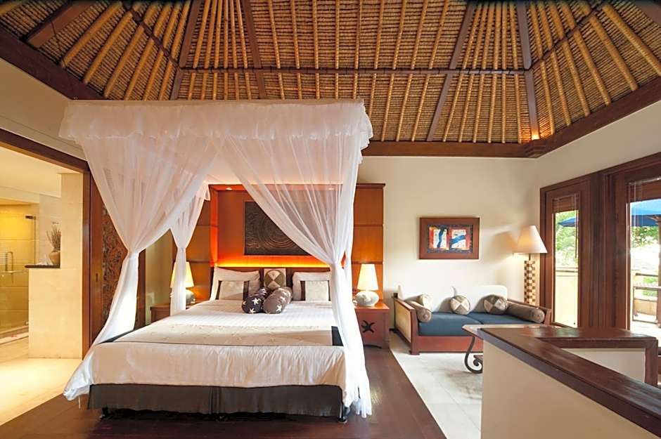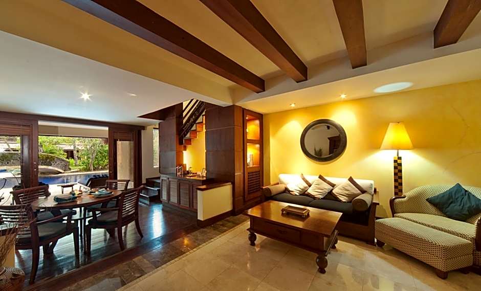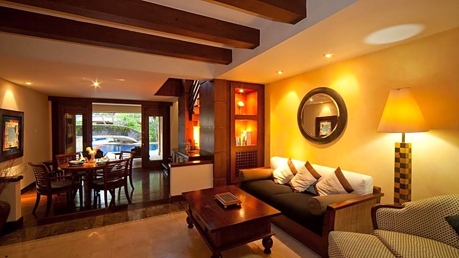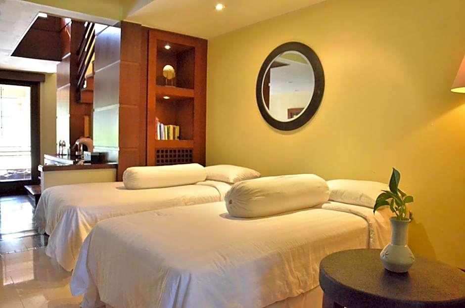 This spacious two-story villa can accommodate up to 4 guests. A king sized bed is available on the second floor, while the twin beds are on the first floor. This villa also features a private hot tub and direct access to the swimming pool. The private bathroom has shower facility, toiletries, and fresh towels.