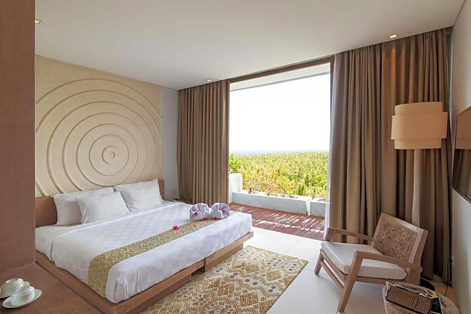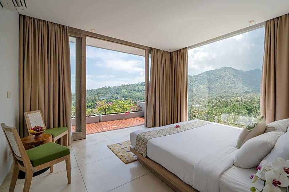 Guests can enjoy pool, mountain, and sea views from the room.
