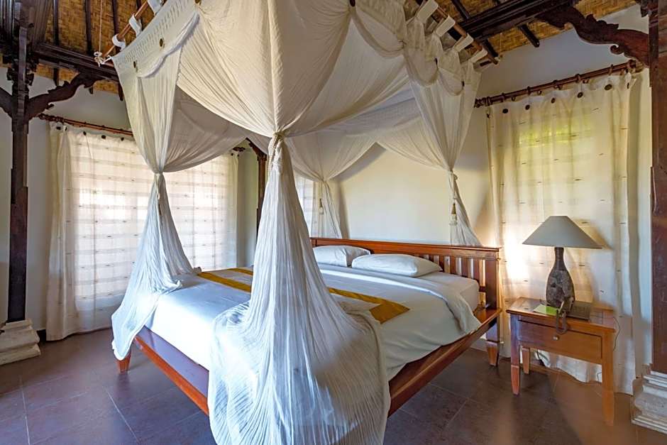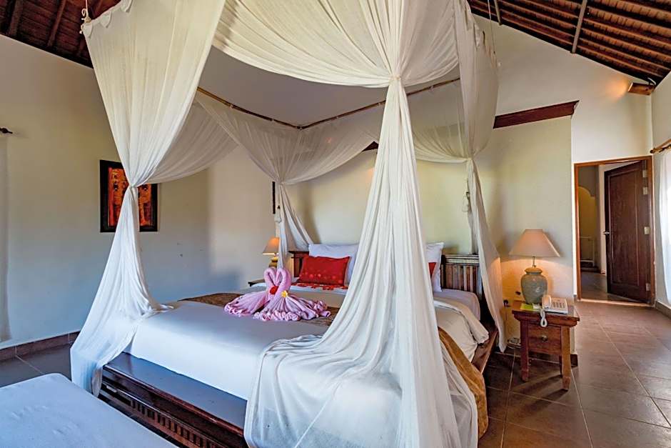 This Balinese-style villa offers beautiful views of the rice fields. Private bathroom comes with a bathtub and an outdoor shower.