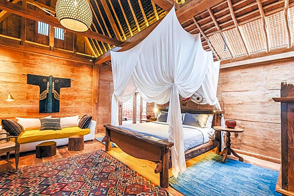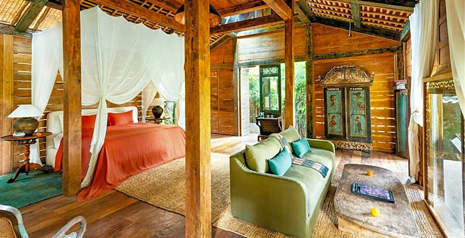 This spacious and antique wooden teak house is surrounded by thick and lush greenery. Tastefully decorated with antique furnishings, the house oozes an atmosphere that is akin the opulence of early Javanese royalty. There is a gazebo where guests can enjoy a lazy afternoon. The air-conditioned bedroom comes with a comfortable four-poster bed and a seating area. Featuring a semi-open shower facility, the private bathroom also provides free toiletries, Mini-bar, towels, and linen are also provided Please note that this unit can accommodate 1 extra bed.