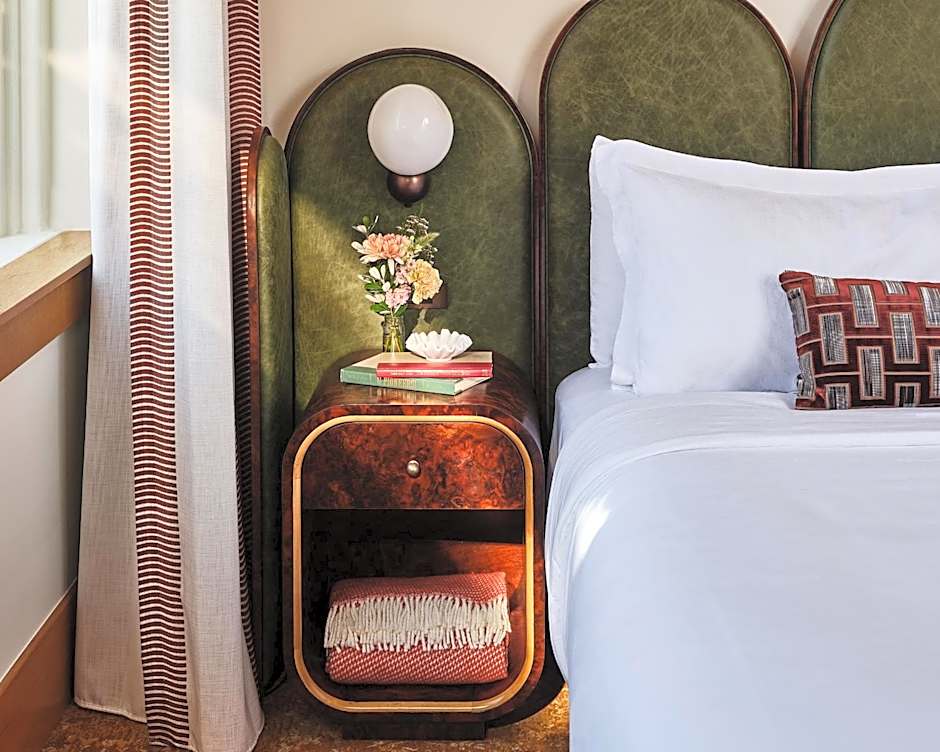 Thoughtful amenities include an in-room espresso machine and luxury bath products for ultimate rejuvenation. An inviting king bed anchors the space, accented by a custom-designed headboard with integrated lighting and a sophisticated scalloped detailing that harkens back to turn-of-the-century craftsmanship.