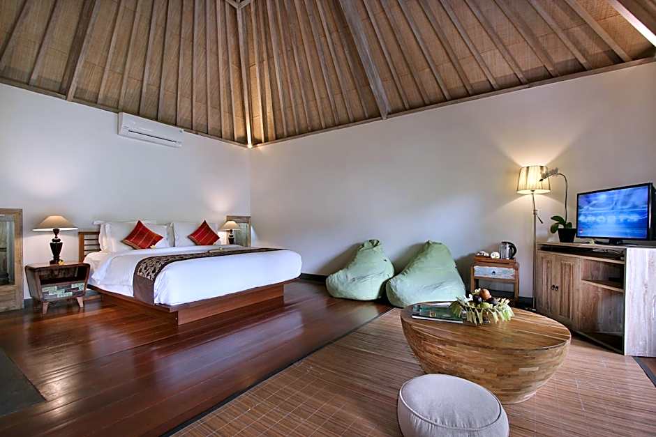 This air-conditioned villa features a seating area with a sofa and garden views. The spacious bedroom is located upstairs, while the private bathroom comes with luxury amenities is on the ground floor.