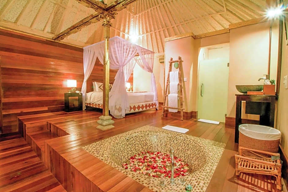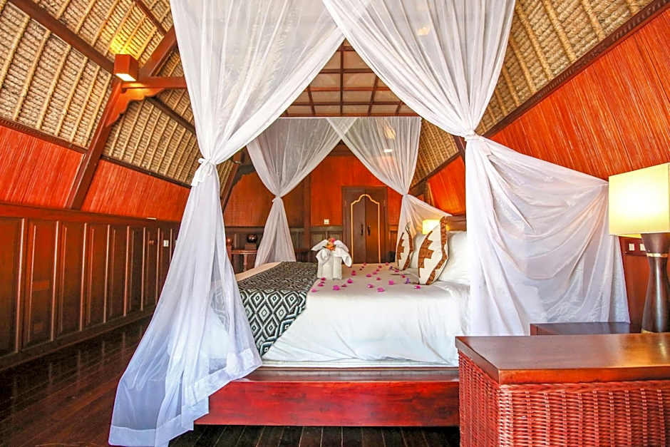 This towering two-story villa overlooking the vast and verdant valley has been built in the inimitably rich Balinese style. The luxuriant bedroom is traditionally decorated, while the generous bathroom is equipped with a magnificent shower and bath.