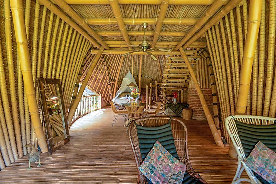 A beautiful bamboo lodge with a great view. Everything was comfortable. The beds were great. The villa is close to several good cafés and restaurants. You can walk to some shops nearby. For the ubud centre you need a taxi or scooter. The villa can't be reached by car or scooter. The last few minutes (2 -4min) is walking. There are some small wild animals, like gecko's that sometimes come in the villa. Not harmful, they give you a real "jungle" feeling. We had a very relaxed feeling here. The staff is absolutely nice, respectful and helpfull with everything you need.
