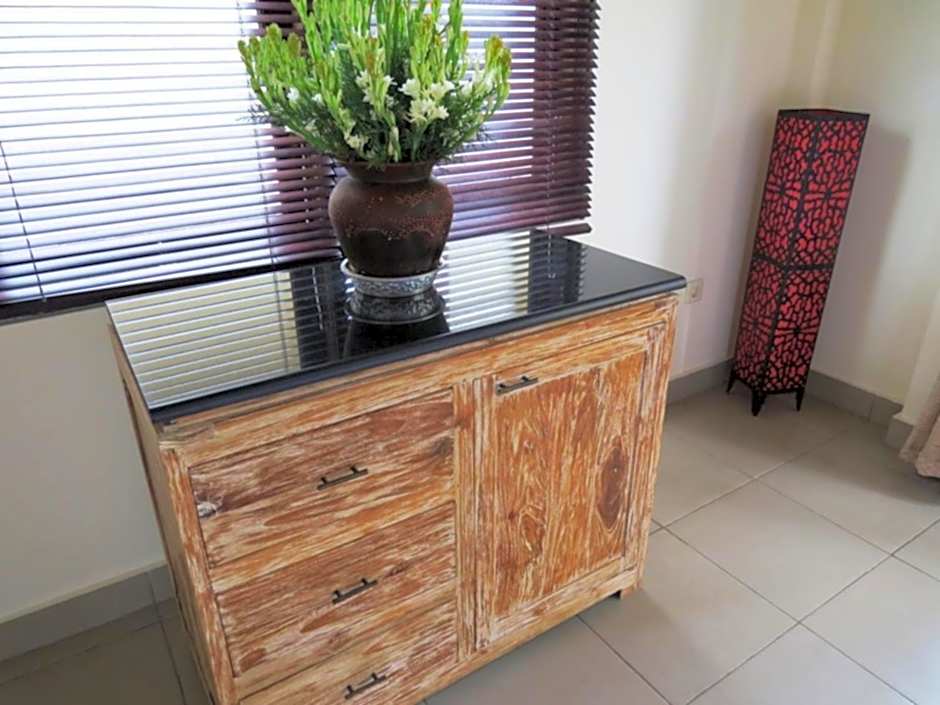 This spacious and well-furnished bungalow features a patio with comfortable couch. It features a large bathroom with a walk-in shower. This cottage is air-conditioned. Safety box is provided.