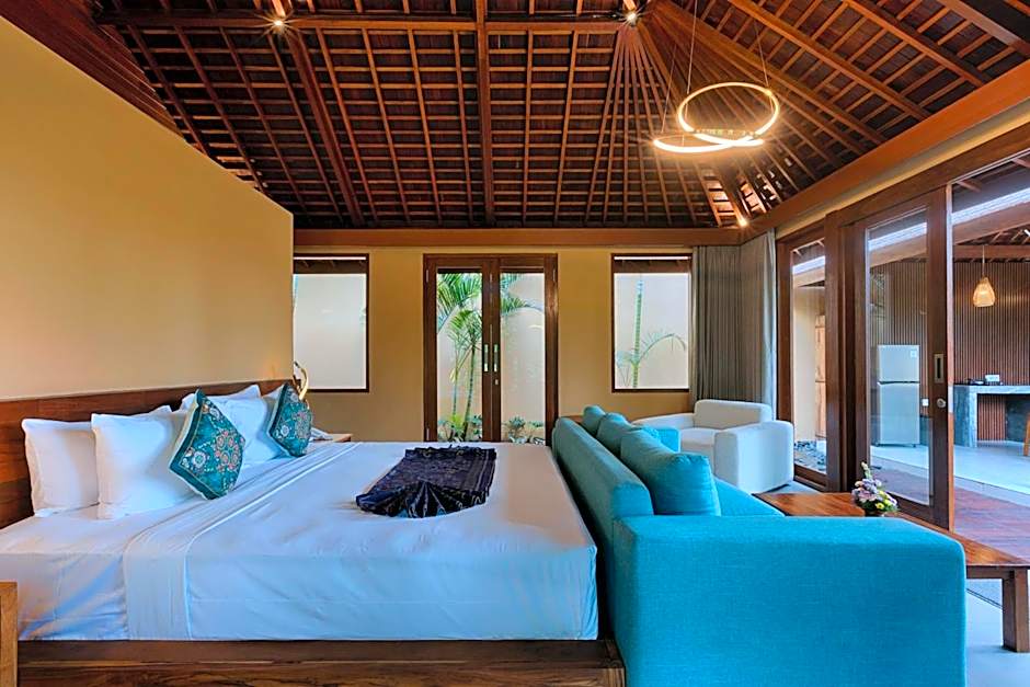 At Samkhya Villa Ubud, guests can choose from various types of villas, including One Bedroom Private Pool Villas with Sacred Valley or Ricefield Views, Two-Bedroom Pool Villas with Valley Views, and One-Bedroom Villas with Living Rooms. The rooms do not allow smoking, and they offer king or queen-size beds, some with additional sofa beds for children. The villas accommodate either 2 adults and 1 child or 4 adults, depending on the room type.