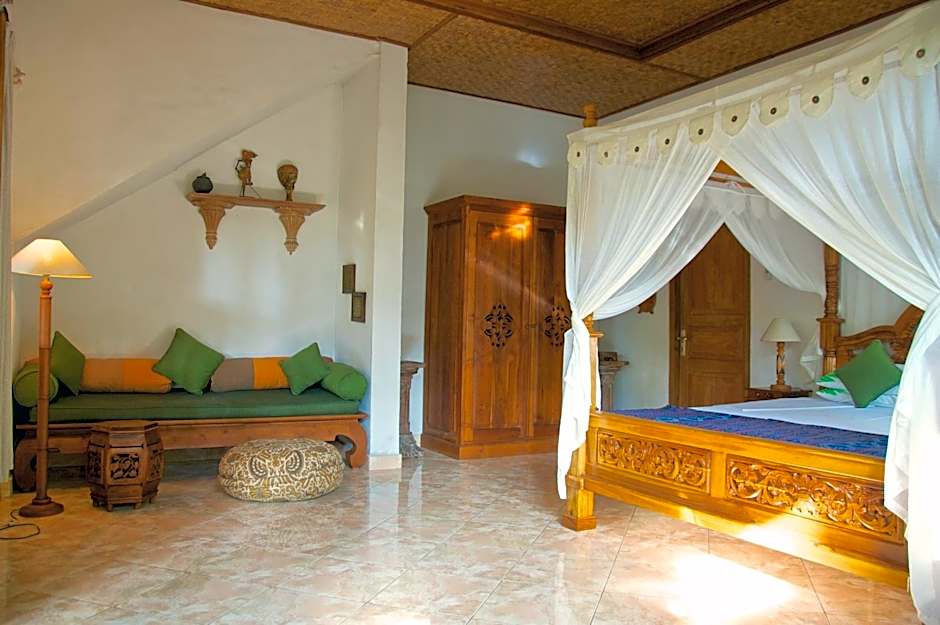 Located on the upper level, the air-conditioned room has a 4-poster king size bed and a single sofa bed. The room has a ceiling fan, a personal safe, and a mini-bar. En suite outdoor bathroom comes with a shower.