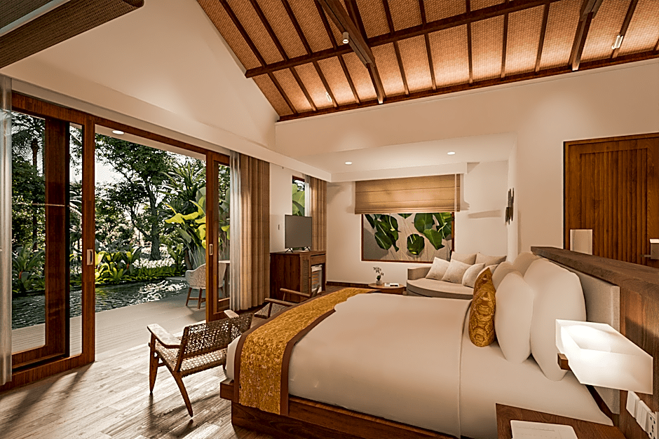 This spacious pool villa, offering 68 sqm, is the ultimate romantic enclave. Each villa features an extra king size bed, led TV, luxurious bathroom, large work desk and private pool.
