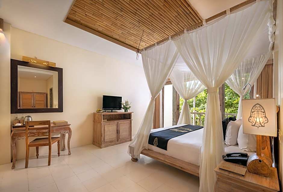Overlooking the Petanu river, this spacious air conditioned suite has a private entrance, seating area and terrace. Fitted with a flat-screen satellite TV, CD/DVD player and a laptop safe. Complete with an electric kettle, mini-bar and mosquito net. The marble private bathroom comes with a bathtub, shower and hairdryer. Guests enjoy: - Daily afternoon tea - Daily yoga - Daily ricefield trekking - Scheduled shuttle to/from Ubud Center - WiFi in all areas - Daily fruit basket - Daily 2 bottles of mineral water