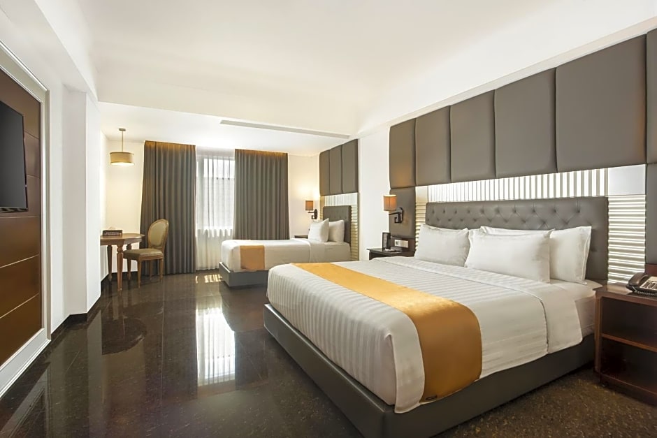 The Grand Rohan Jogja hotel offers several types of rooms. These include the Premium Suite, Deluxe Double Room, Family Room, Deluxe Double Room with Balcony, Deluxe Twin Bed, Executive King Room, and Deluxe Twin with Balcony. Smoking is not allowed in any of the rooms. The room sizes range from 291 sqft to 646 sqft. The rooms can accommodate 2 adults and 0-1 child, depending on the type of room.