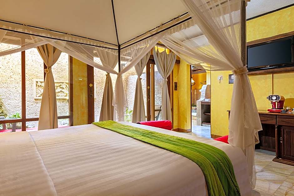 Spacious air-conditioned room features an open-air or indoor bathtub, and a private balcony or terrace overlooking the gardens and pool. Bed is fitted with mosquito nets. You will find an electric kettle and a flat-screen TV in each room.