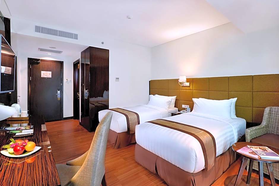 The Atrium Hotel & Resort Yogyakarta offers three types of rooms: Executive Suite, Deluxe Twin Room, and Deluxe Double Room. The Executive Suite is a spacious suite with a size of 603 sqft, suitable for 2 adults and 2 children. Smoking is not allowed in any of these rooms. The Deluxe Twin Room and Deluxe Double Room both have a size of 301 sqft and can accommodate 2 adults and 2 children. The Deluxe Twin Room has 2 twin beds while the Deluxe Double Room has 1 king-size bed.