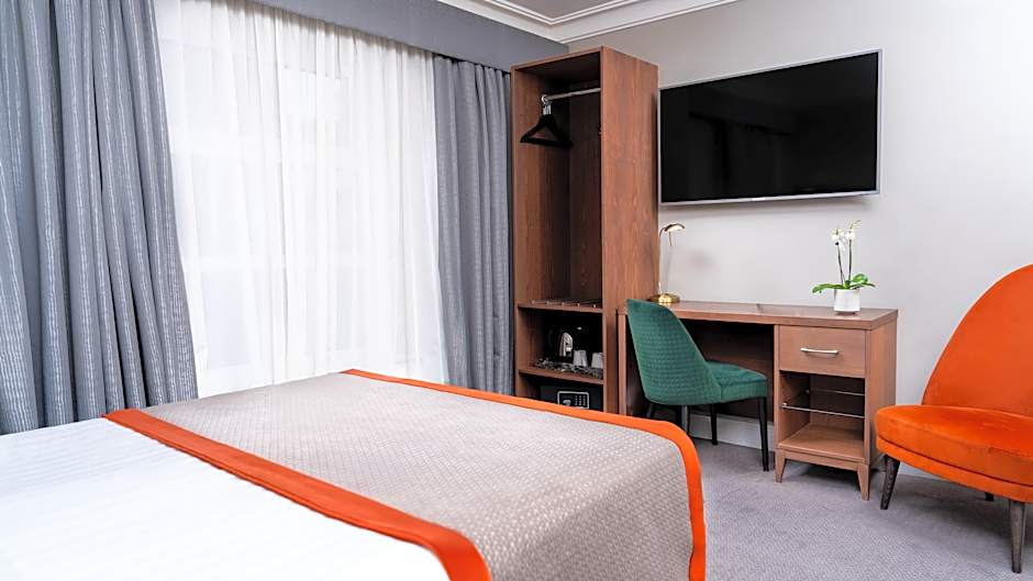 Elegance Room feature a king size bed. These unique bedrooms are decorated to the highest standard in keeping with some of the historical features of the building some of which includes fireplace and the original bedroom window shutters. This large room features a large working desk with built in Type G and C sockets, in- room safe, air conditioning, plus luxury toiletries for your enjoyment. Tea & Coffee making facilities include hot chocolate, herbal tea and biscuits to assist you in enjoying the comfort of this beautifully restored bedrooms. Elegance Double Room Elegance Room feature a European king size bed.
