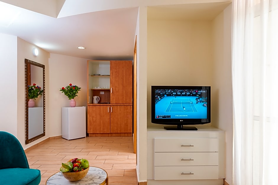 DOUBLE + 1 CHILD DELUXE ROOM is 344 square feet and includes a king-size bed 150-183 width plus living room and extra beds on demand and is Wheelchair-accessible with a Disability-friendly bathroom.