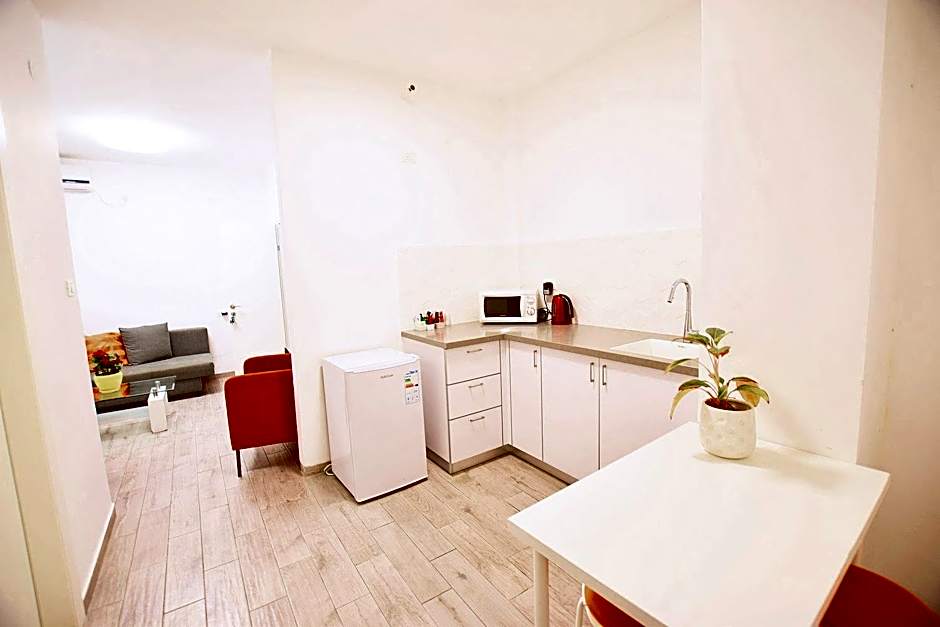 A very spacious room with an extra long bed, a kitchenette and fridge. The additional sofa opens into a double bed. The room also features a shower and toilet. A plasma TV with cable channels is available, while the fridge offers free mineral water.