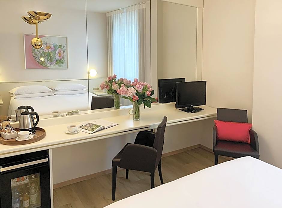 I chose the Starhotels Cristallo Palace for its excellent location between the airport (3.3 km/46 minutes walk southeast) and the old town (3.5 km/47 minutes northwest). Despite the fact that you can check in from 3 p.m., my room was ready 2 hours earlier. I didn't even meet the check-out time, which is between 10 a.m. and 12 p.m. I had to be at the airport in the morning, so I checked out before 10 a.m. The receptionist was also very nice and spoke good English. I was accommodated in a Classic single room with a private bathroom with a shower. The essential room equipment was air conditioning. From the room I had a view of the city, and when I leaned out the window slightly, also of the old town. Breakfast is served buffet style. What I liked most was the daily selection of 4 different types of sweet croissants.