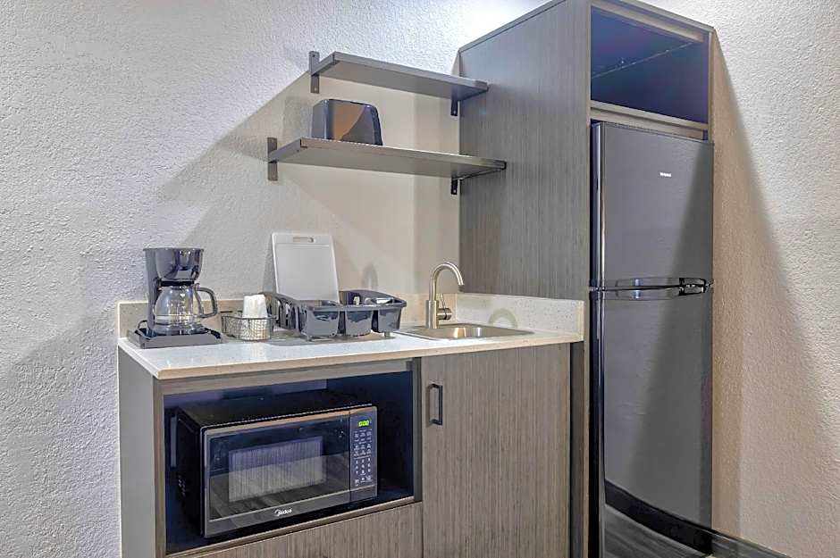 It was remodeled and the room was spotless and spacious. Large fridge with ice trays small kitchen sink a toaster coffee maker microwave iron and full size ironing board A new dish drainer and cutting board. Even 2 dish washing towels and 2 matching drying towels.
