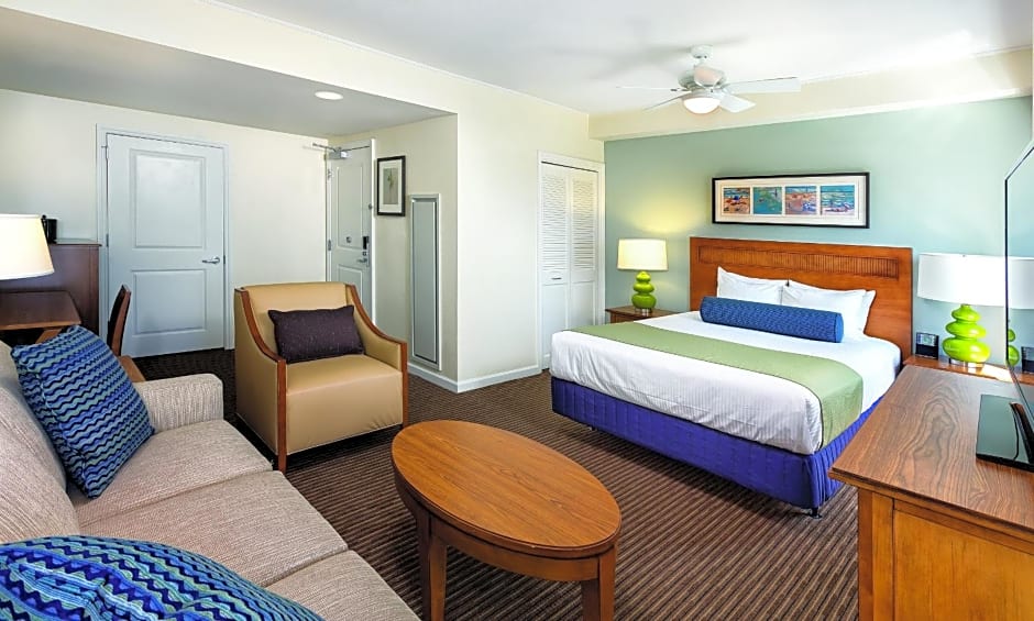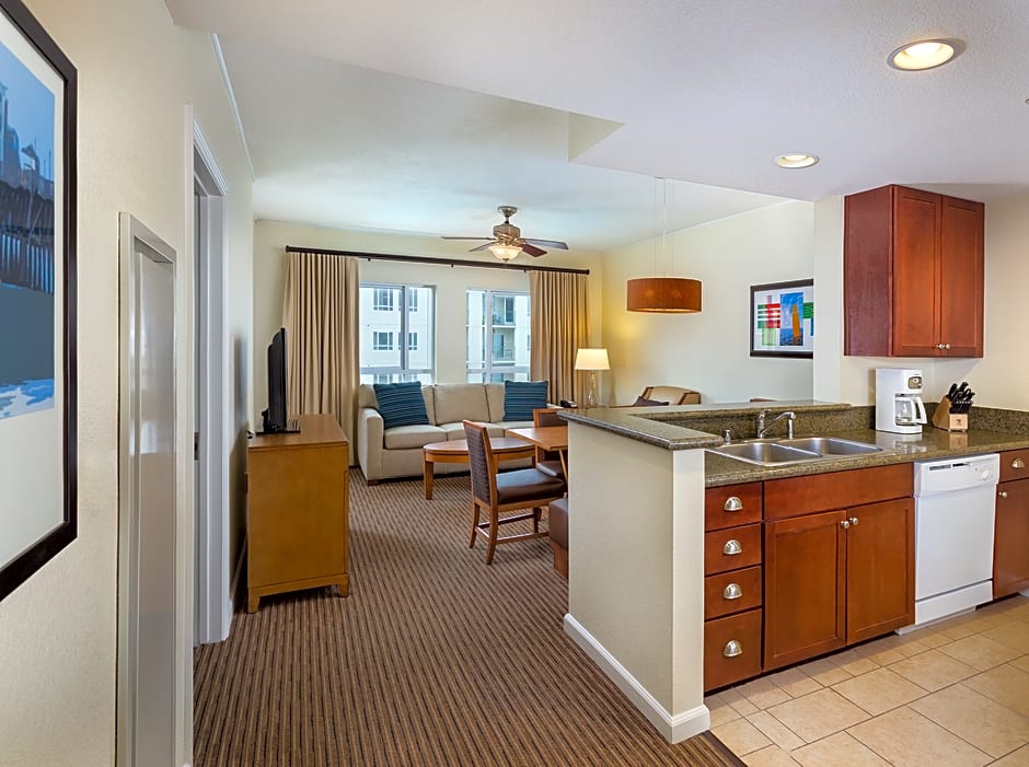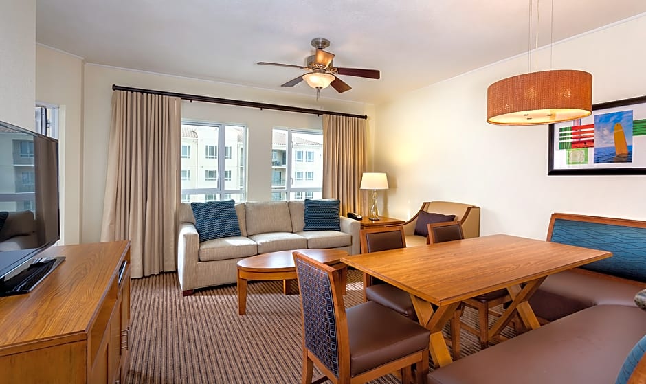 First time staying in Oceanside. The location is very nice. We arrived mid day, and the room was ready. We also got late check out, and since we were not owners at this timeshare, we were able to park across the hotel at an open parking lot for $5 a day. We got our key wristbands from Concierge and, of course, offered us gifts deals ( timeshare sales rep) We nicely refused, and the rep wasn't pushy. The lobby was nice and comfortable. Had stacked fridges of snacks and drinks (non alcoholic). Self-serve scan and go pay kiosk. Very convenient. The 1 bedroom room on the 3rd floor was super clean, no weird smells, no dust, a balcony, partial ocean pier, and pool view. Spacious plenty of room for two people fully equipped as a furnished apartment. Had a washer and dryer, vacuum, and full kitchen with all the necessities. Central air-conditioned, freshly painted walls, curtains looked as new. The king-sized bed was comfortable, with very clean bedding. The bathroom had a jacuzzi tub with a shower that had shampoo and conditioner, body wash bottles wall mounted. Towels were super clean and not old. The furniture was acceptable, but I would like to see an upgrade in the future as well as the carpet (was clean but old-fashioned). Queen sofa bed super heavy and needs upgrade. Things to do were walking distant to downtown, pier, beach, and other neighboring hotels. The harbor 5 minutes drive and many options of restaurants to choose from. I recommend Joe's Crab Shack.