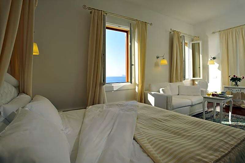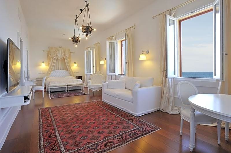 Large suite with a living area and a balcony overlooking the Mediterranean Sea.