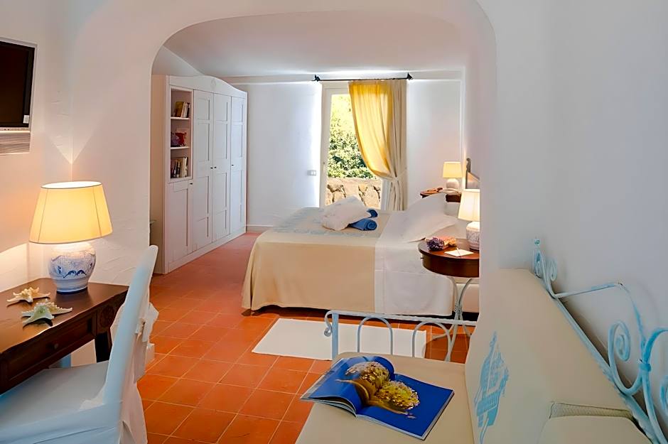 Room with attached bathroom decorated in a traditional Sardinian style, with terracotta floors and pastel colors. The balcony is equipped with table and chairs and overlooks the marina of Porto Cervo. The large bathroom is in gilded marble.