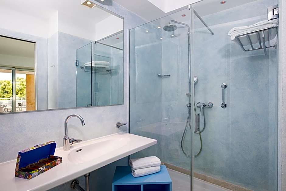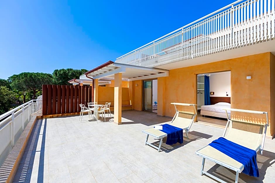 The hotel is located in a quiet town on the seashore. The area is large, the pool is excellent, even with a jacuzzi and a good slide. The area is constantly washed and cleaned. You can find entertainment for every taste: tennis, ping pong, mini golf, live music in the evenings. Excellent service and helpful staff made our stay unforgettable. Comfortable, clean rooms, towels changed every day, enough supplies, beautiful grounds with pine trees and a beautiful beach in the bay. You can rent sun loungers and umbrellas on the beach. 1,2 rows about 15 euros for 2 sun loungers. The rows further are free for hotel guests. We took a family room with breakfast. We had lunch at the II Corallo restaurant, in pizzerias nearby, and a cafe on the beach. You can buy everything you need in a store 20 minutes walk from the hotel. We recommend it to everyone.
