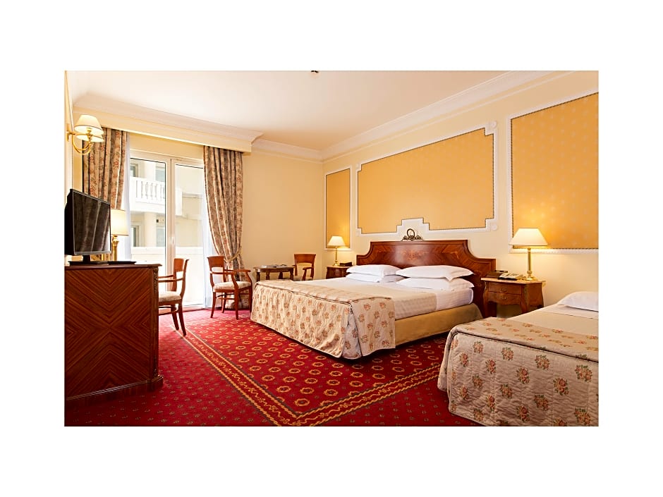 The Grand Hotel Vanvitelli offers a variety of room types including Standard, Superior, Family, Suite, Triple, and Quadruple Rooms. All rooms do not allow smoking and can accommodate 2 adults and 1 child. Bed sizes vary from Queen size to Twin beds, with room sizes ranging from 215 sqft to 646 sqft.