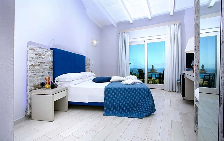 Large, modern Junior Suite with jacuzzi bathtub in the room, a 43-inch flat-screen TV with pay-per-view channels and individually controlled air conditioning. Features extra pillows. A floor-to-ceiling window offers access to a furnished terrace with full views of Castelsardo and the sea. The private bathroom is complete with bathrobes and slippers, hairdryer, shower, and toiletterie. Private Parking lot