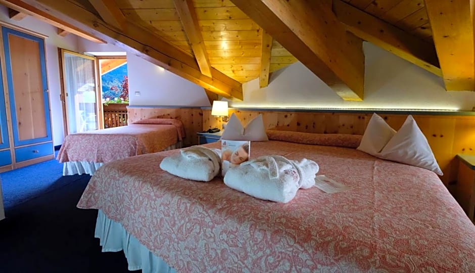 The hotel La Roccia Wellness Hotel offers a variety of room types including double or twin rooms, family rooms, triple rooms, standard double or twin rooms, and various suites. Smoking is not allowed in any of the rooms. The occupancy of the rooms ranges from 2 adults with 1 child to 4 adults with 3 children. Bed sizes vary from queen size beds to twin beds, with some rooms also having sofa beds. Room sizes range from 183 sqft to 1076 sqft.