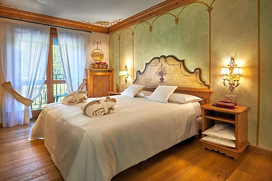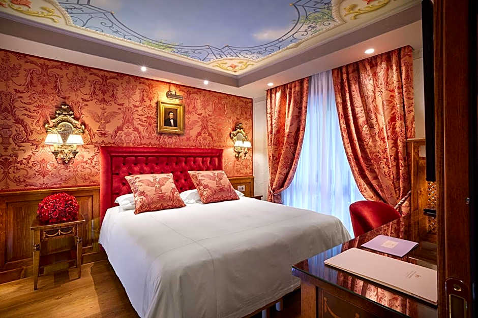 Spacious suite with elegant furnishings, a seating area, and a balcony. Features antique paintings and precious fabrics. The private bathroom offers soft bathrobes and slippers.
