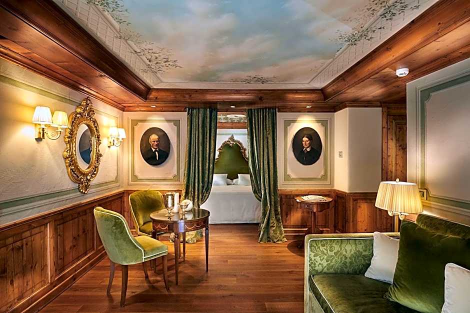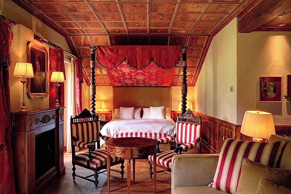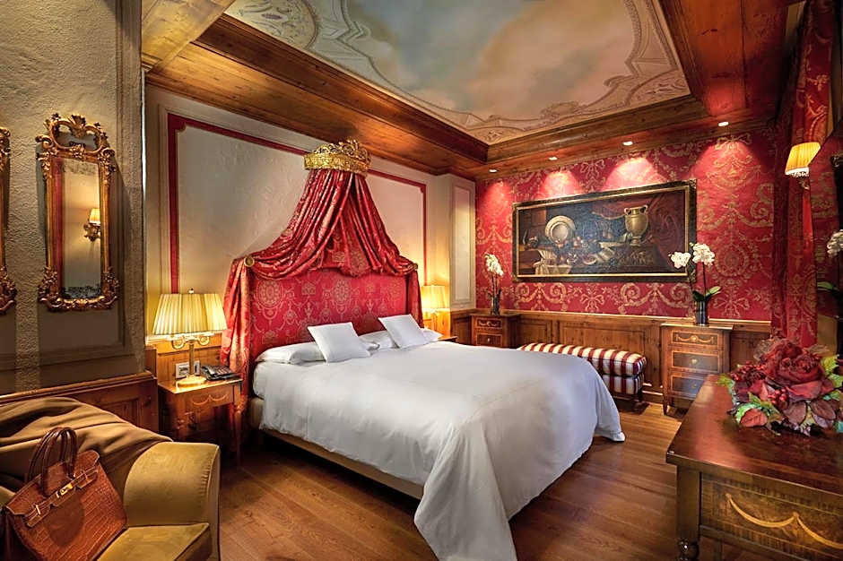 Spacious suite with coffered ceilings, a fireplace, and a spa bath. Features 2 balconies, elegant furnishings, and precious fabrics. Includes a four-poster bed.
