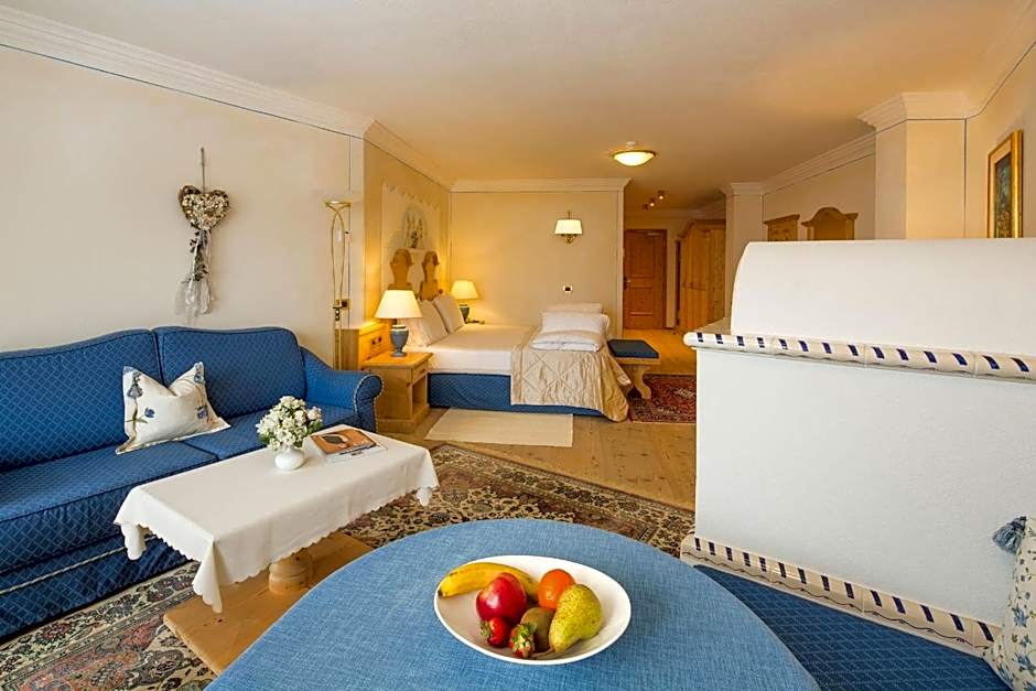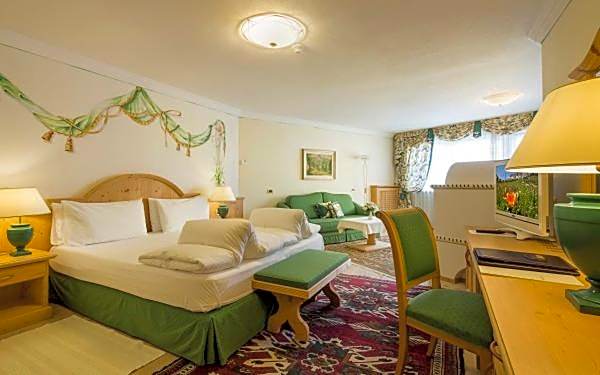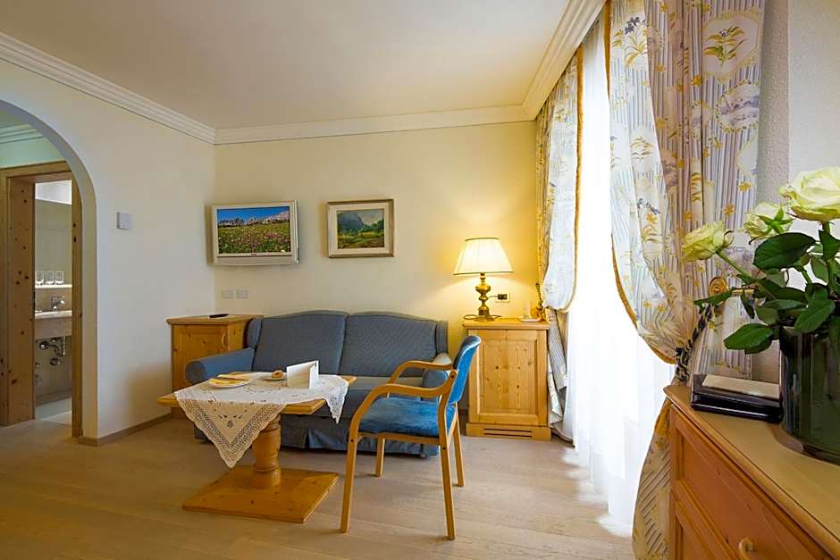 The hotel features an on-site restaurant called Ristorante Sassongher, which serves Italian, Mediterranean, local, and international cuisine. The restaurant has a family-friendly, traditional, and romantic ambiance.