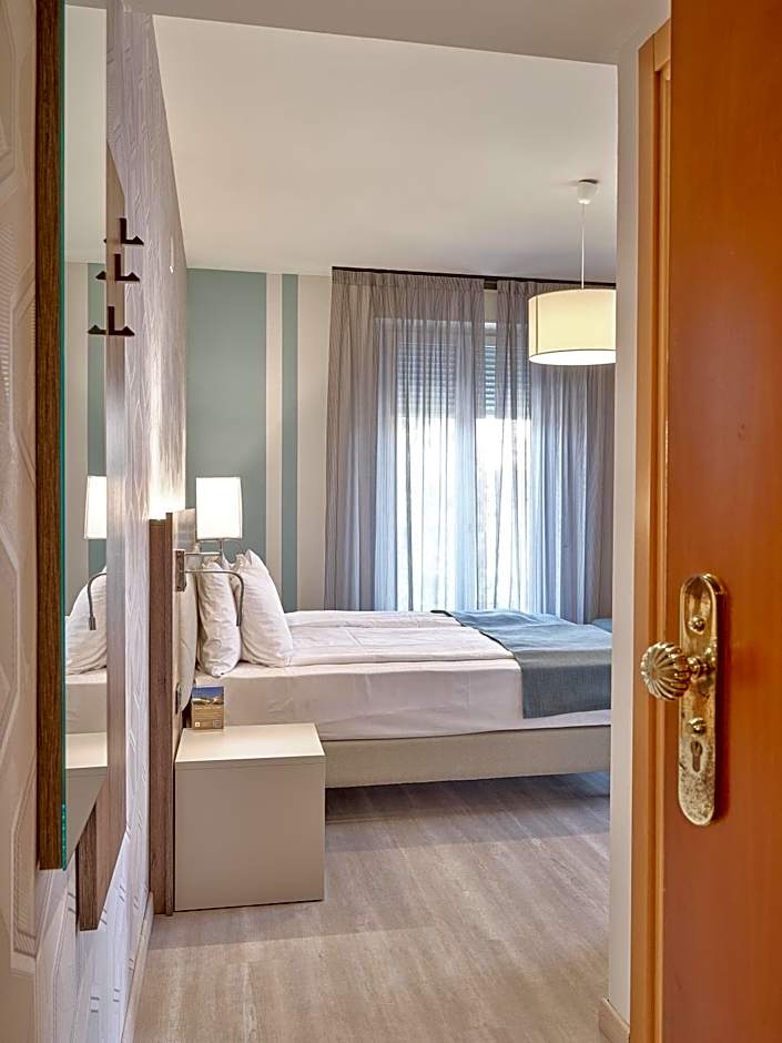 Set back from the main promenade so quieter but just a short walk to the lake. Lovely swimming pool. Lunch and drinks on a big shady terrace near the pool. Wonderful buffet breakfast. Best thing was the staff. So friendly and pleasant and helpful! We had a package from Jet 2 in the older and more basic accommodation but it was still very comfortable. We separately booked a room for our youngest daughter and family which was in the newer wing which had a few more benefits and a bigger balcony which they loved. We requested the room near to each other and the lift. Although they said they couldn’t promise it they managed it. Bravo!