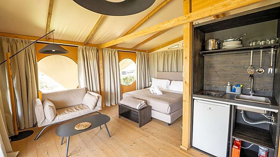 Guests can make meals in the kitchen that is fitted with a stovetop, a refrigerator, kitchenware and a tea and coffee maker. The tent offers air conditioning, a private entrance, a terrace with sea views as well as a private bathroom boasting a walk-in shower. The unit has 2 beds.
